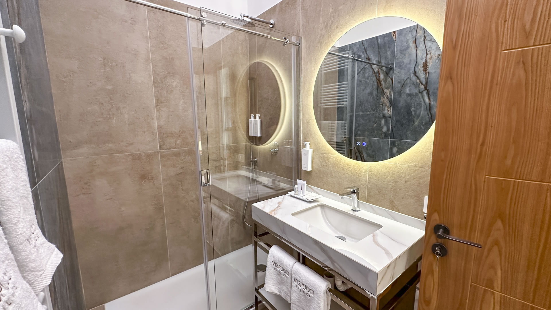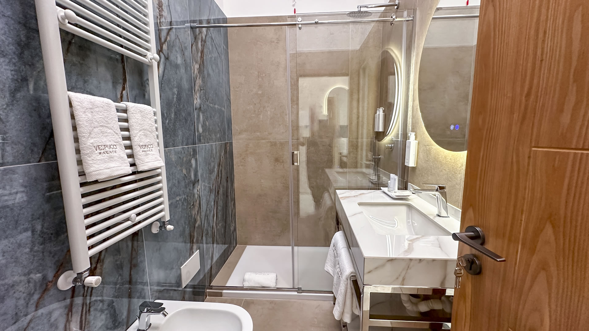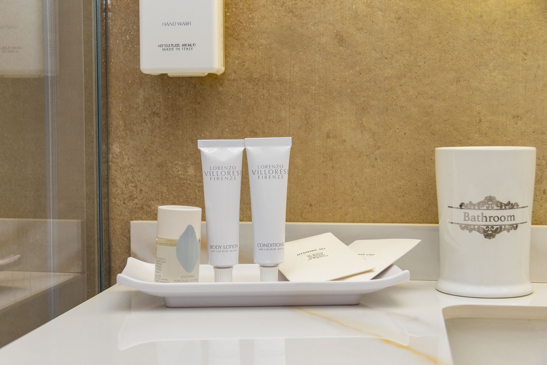 Il bagno, realizzato con materiali di pregio, vanta una spaziosa doccia, un esclusivo set di cortesia firmato “Lorenzo Villoresi Firenze”: le sue fragranze uniche e i prodotti per la cura del corpo offrono un’esperienza sensoriale indimenticabile. Asciugacapelli, morbidi teli di spugna e ciabatte di cortesia fanno parte del set standard presente all’interno delle camere.