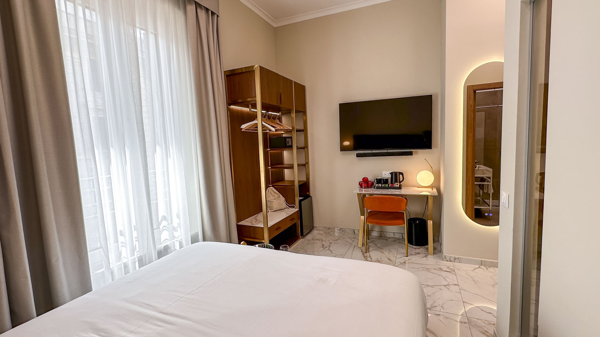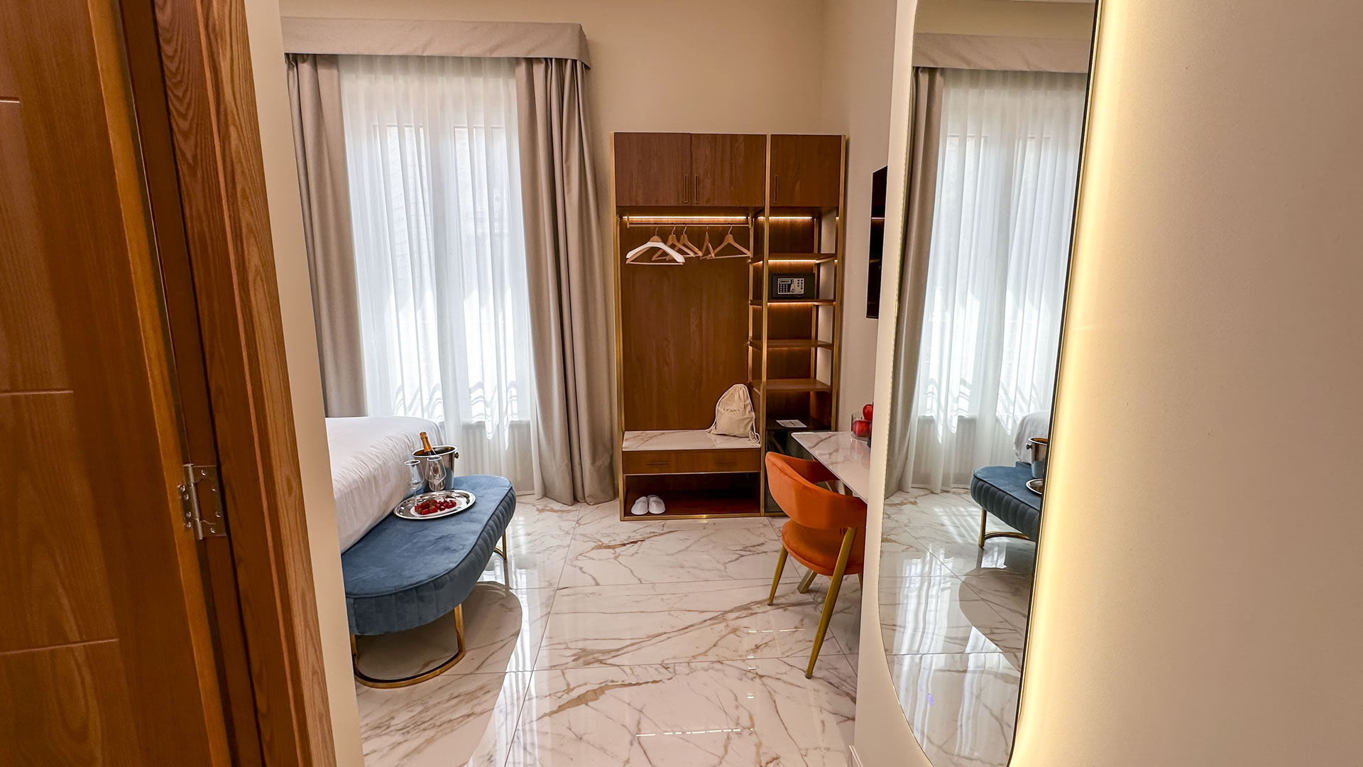 La nostra struttura vanta un design raffinato e contemporaneo, dove ogni dettaglio è stato curato per creare un ambiente accogliente. Le camere, arredate con mobili di design e dotate di comfort moderni, offrono un rifugio perfetto dopo una giornata di esplorazione nella città eterna. Ogni camera è dotata di materassi anallergici con testata letto comfort, porta valigie, appendiabiti, frigobar, bollitore con tè e caffè di cortesia, ed un fornito minibar con snack e bevande.